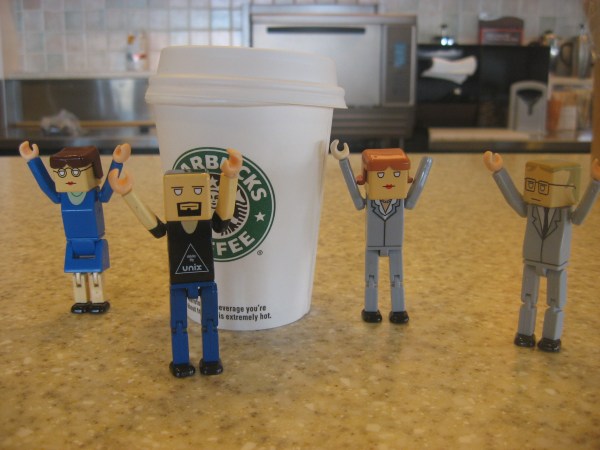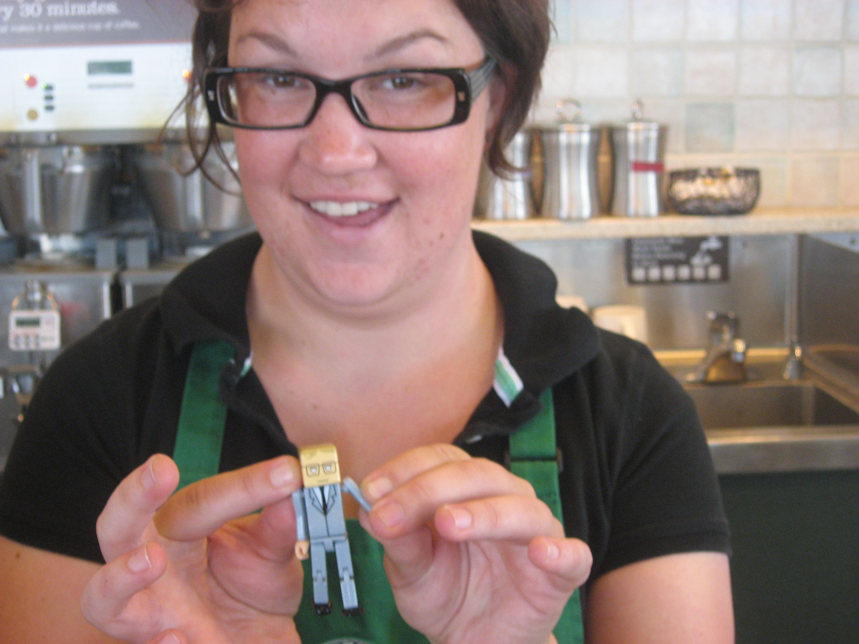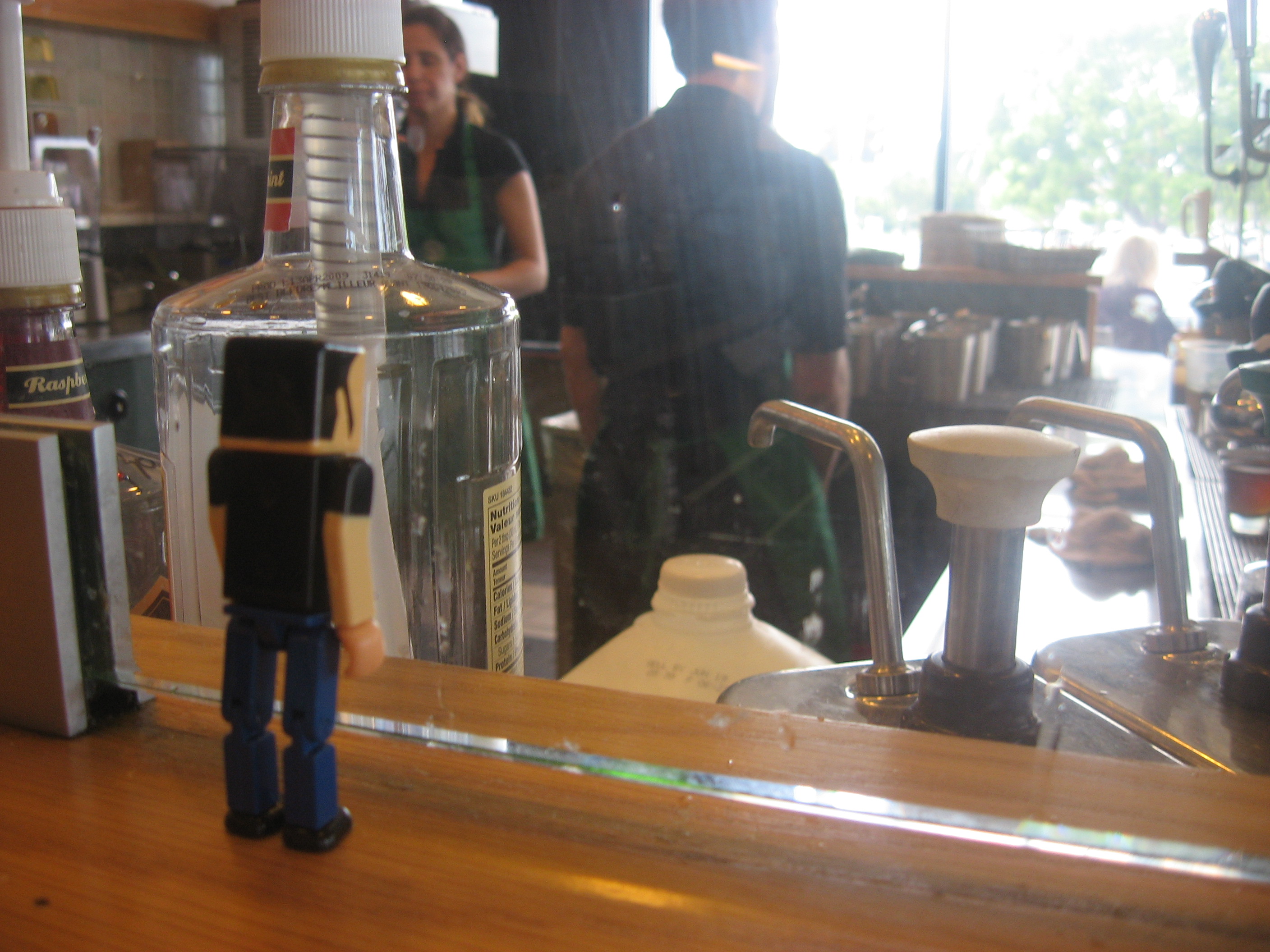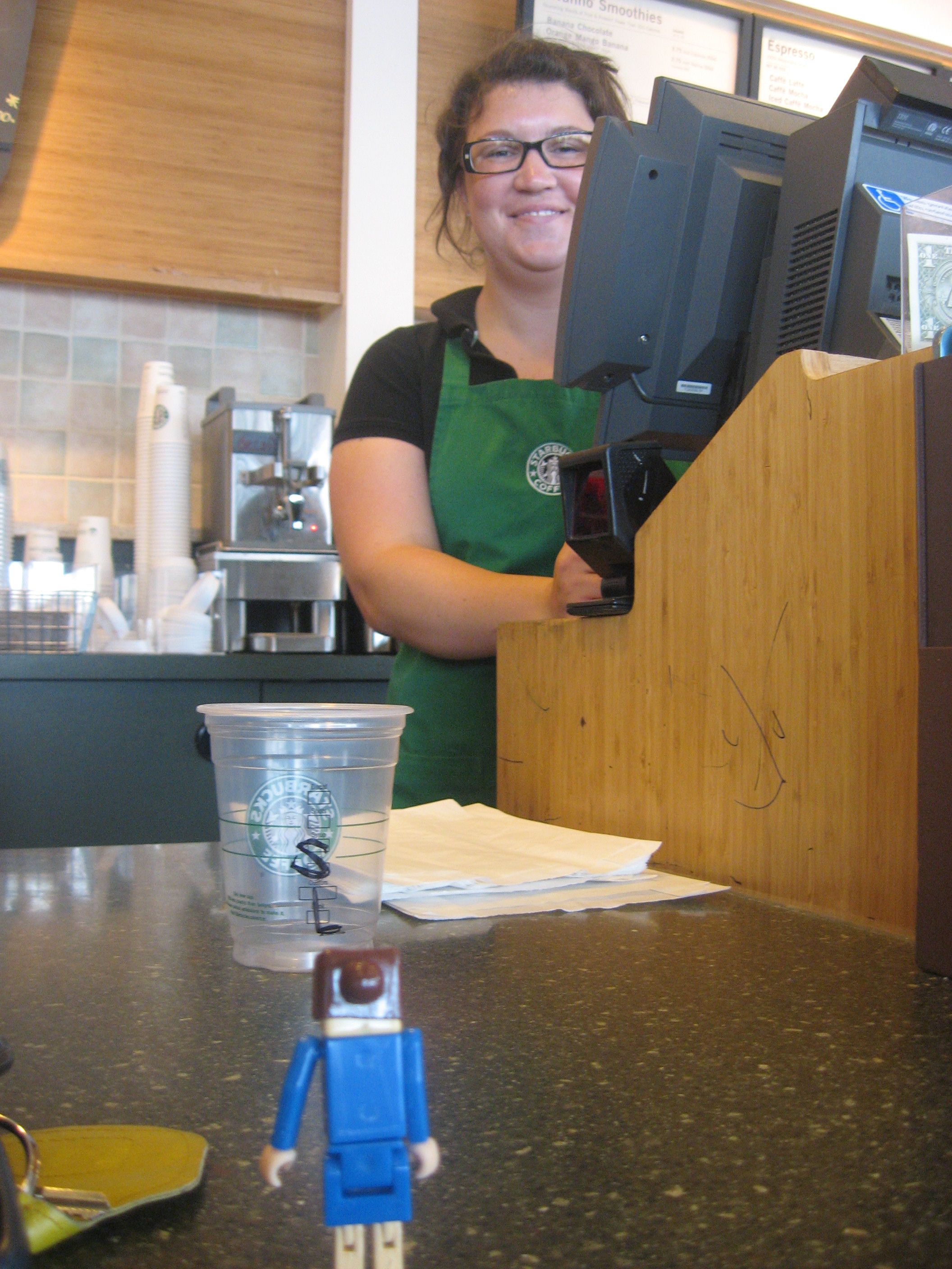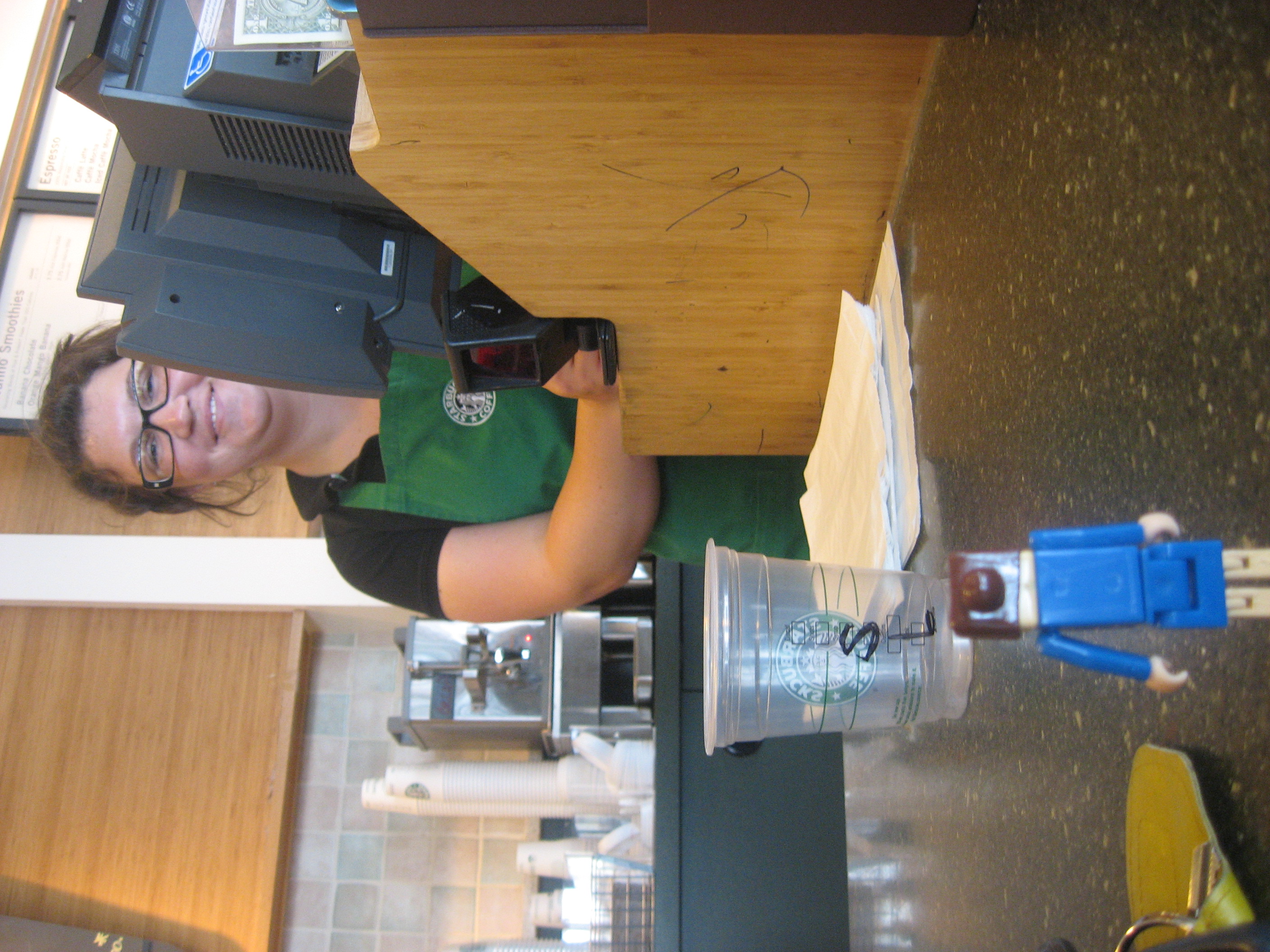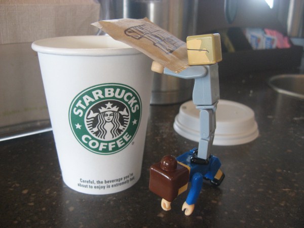 Another successful Starbucks run! Bob has his arm back and, most importantly, I have my coffee.