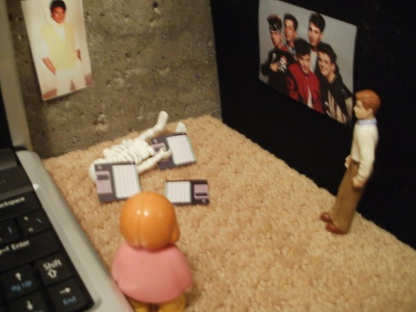 Off in the corner there were some posters. And a skeleton covered in floppy disks.