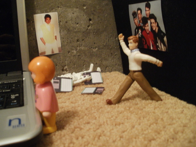 He took a moment to gather himself. Then, as he was standing over by the New Kids on the Block poster, a strange thing happened. He felt the spirits of Jonathan, Jordan, Joey, Danny and Donnie whispering to him. “Hang tough,” they advised. “We’re gonna put you in a trance with the funky song.”