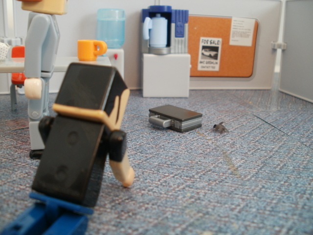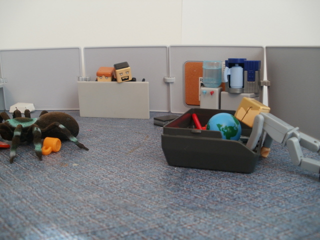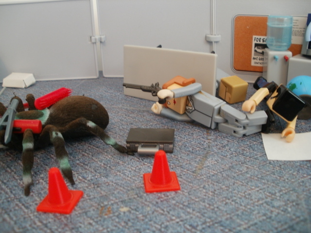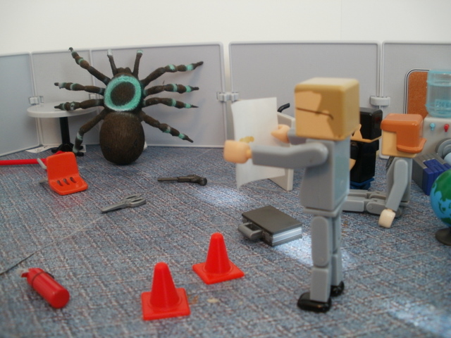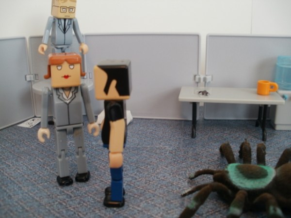 Back in the breakroom, Sue Derek and Bob tried to recover from their ordeal. Then Ted walked in. He knew nothing of the “big spider” incident — he had missed the whole thing. But when he saw the room he gasped. It wasn’t the state of the room that shocked him, it was the little spider. It was back, walking across a piece of white paper on the ground. And it frightened Ted deeply.