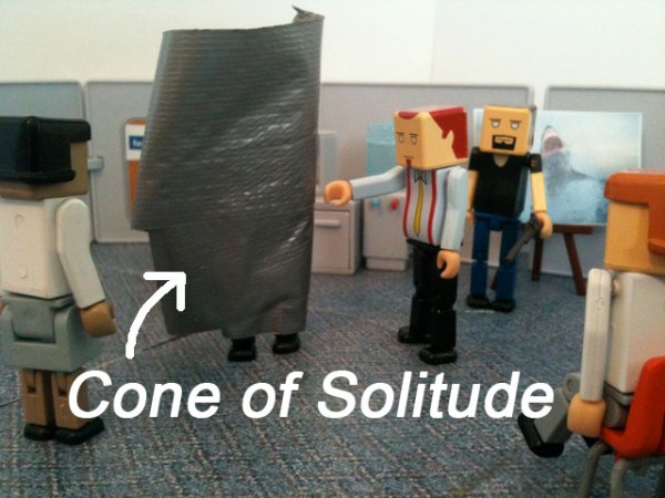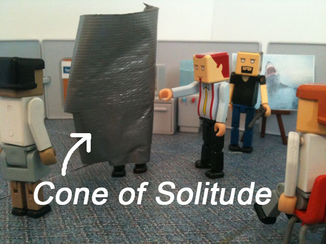 The employees knew they couldn’t have this naysayer around when the investors came. No way. Thinking fast, Derek and Ann used some of the tape to immobilize the therapist in a Cone of Solitude. When Ted began to protest, they wrapped him up too.