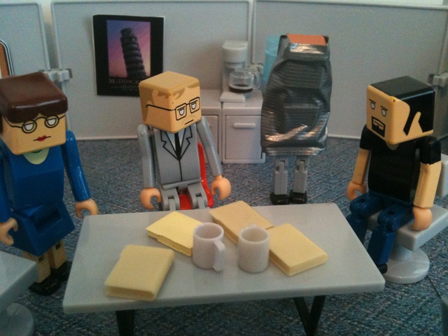 The employees stuck the investors in Grandma Bernice’s cube, along with Ted and his therapist.