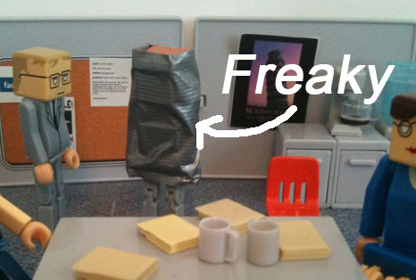 Bob drew eyes and a mouth then glued it to Sue’s taped-up face. Much better.