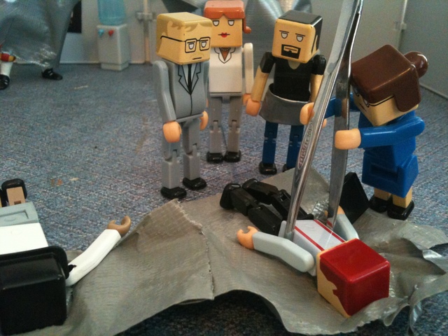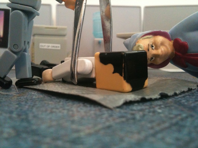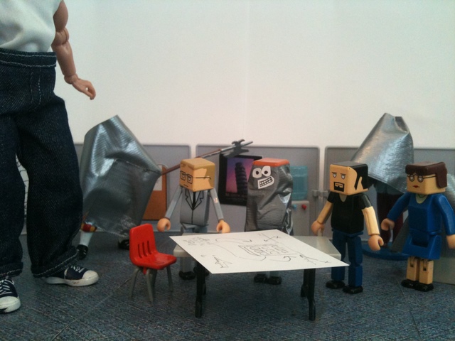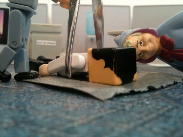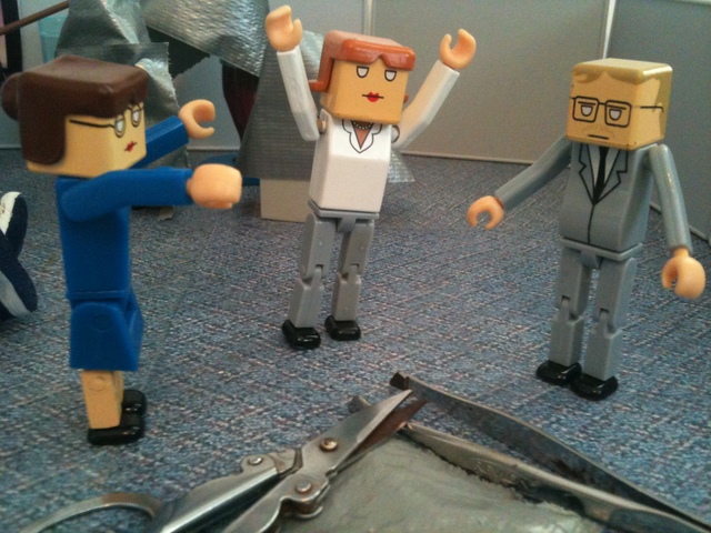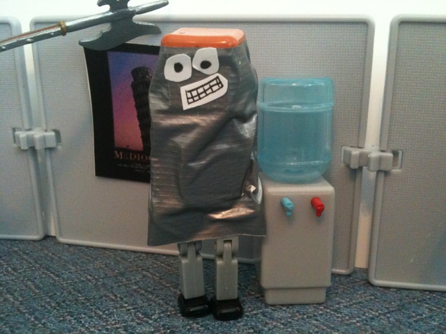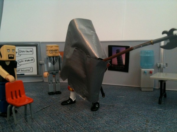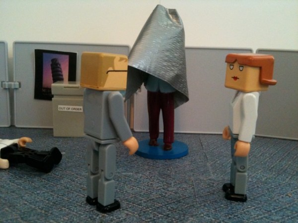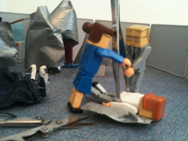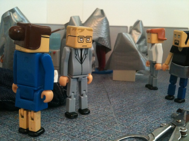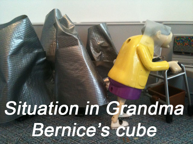 As you recall, the employees had discovered that the duct tape “Cone of Solitude” was an ideal way to get rid of their problems. They wrapped Ted’s therapist in a cone. Then Ted. Then the investors. And they stored them all in Grandma Bernice’s cubicle.