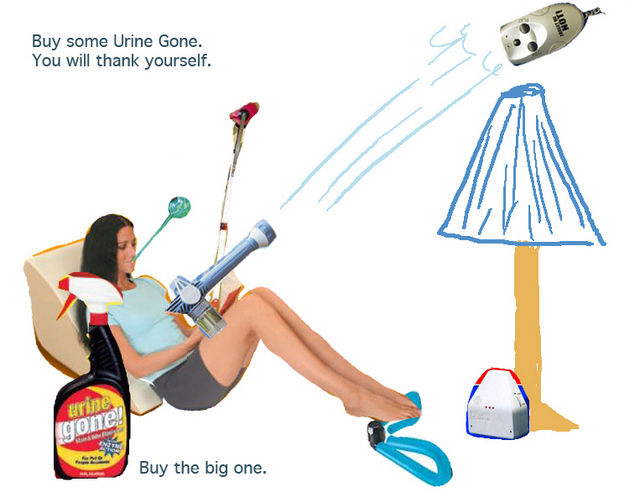 The concept: Attach the ShamWOW and Shark VX3 to the doggie harness. As the pup dashes wildly around the house, the floor gets cleaner and cleaner.