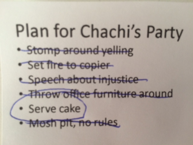 I told Derek to organize a celebration. Derek idolizes Chachi, and looked a little panicked about organizing a party, so I gave him some helpful advice: “Make it perfect and DON’T screw it up.”